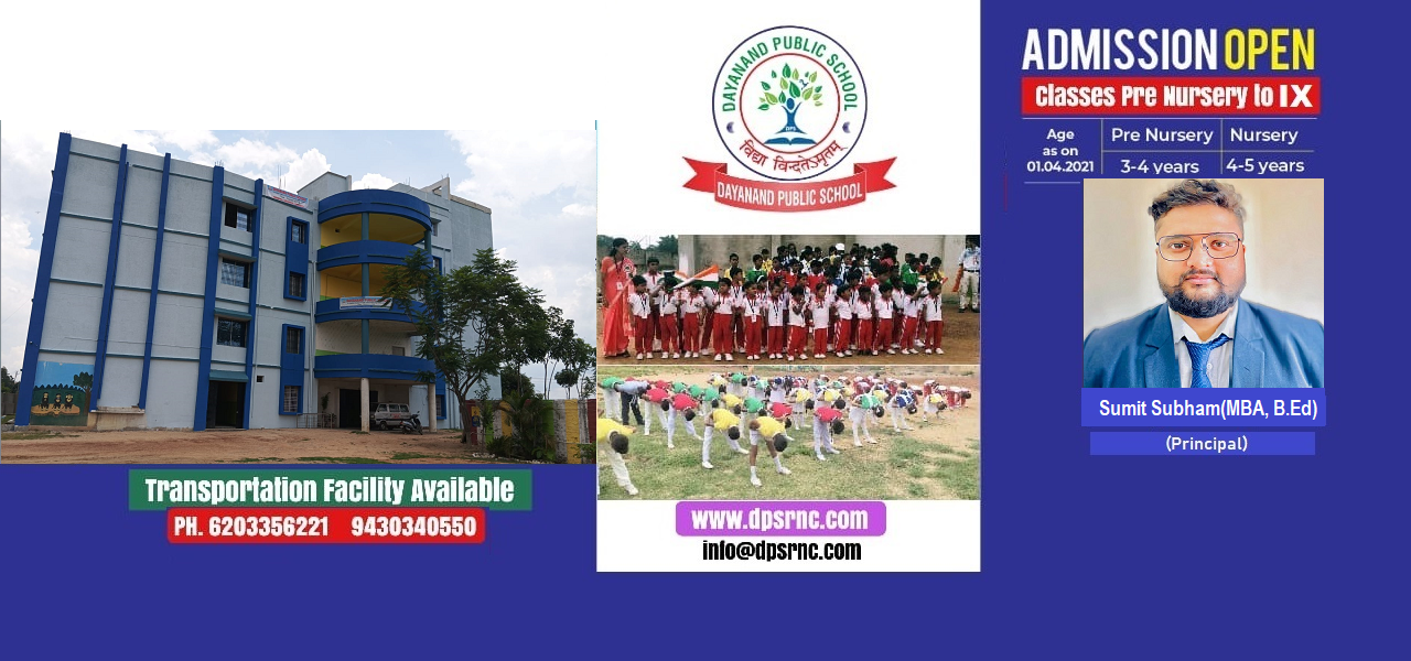 The Story of Dayanand Public School, Ranchi In this Constant changing world we need to interrogate ourselves regularly whether our children in their time are ready to face their challenges? We believe that all children can and will learn. It becomes our responsibility to shape a childs mind and character in such a way so that he/she not only shins tomorrow, but also become a good and responsible individual. A group of people those who keep this vision in mind has started this school in __Ganpatinagar Oppositesail sity (Ganpati Nagar) new Pundag with the name DAYANAND PUBLIC SCHOOL which is run by Care One society .